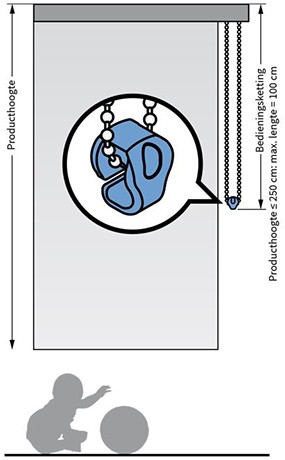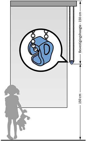 De Child Safety wetgeving is vastgelegd om te voorkomen dat kinderen verstrikt raken in de bedieningskoorden en kettingen van raamdecoratie. De afstand van de vloer tot de onderkant van het koord of de ketting moet minimaal 150 cm bedragen. Wij vragen u daarom de bevestigingshoogte bij uw bestelling op te geven.
